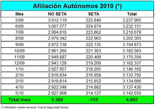 Más Información | Seguridad Social - Informe de afiliación 05-2010 En Pymes y Autónomos | Afiliación de autónomos a la Seguridad Social