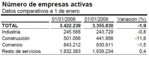 El directorio de empresas activas, sigue mostrando los síntomas de la crisis con un descenso anual del 1,9% a comienzos del ejercicio. En la actualidad, existen 3.355.830 empresas, destancando en estas las empresas sin asalariados que representan el 52,9% del total de empresas con actividad.