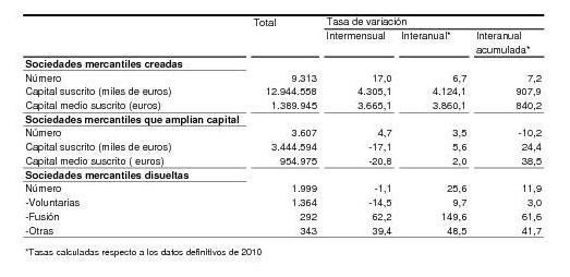 El informe del INE que se acaba de conocer muestra que en el mes de marzo se crearon 9.313 sociedades mercantiles, lo que supone un aumento del 6,7% sobre el mismo dato de 2010 y un 17,0% más que en febrero de 2011. El 99,2% de las sociedades creadas fueron sociedades limitadas y el 0,8% anónimas.