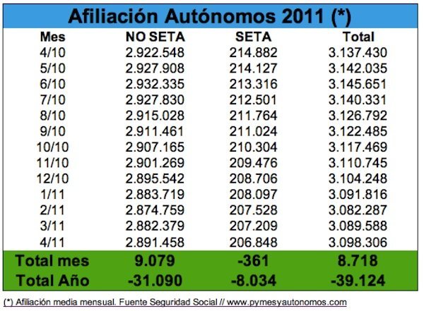 Más Información | Seguridad Social; Informe de afiliación 04-2011 En Pymes y Autónomos | Afiliación de autónomos a la Seguridad Social