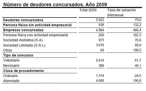El número de personas que se declararon en concurso de acreedores alcanzó la cifra de 5.922, de esta cifra, 4.984 eran empresas y autónomos. Del total de concursos 5.614 fueron voluntarios, es decir, un 81,7% más que el año anterior, el resto, 308, necesarios, lo que supone el 48,1% respecto a 2008.