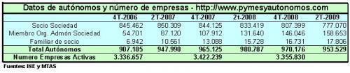 De los datos anteriores se puede deducir que: * El ratio de empresas frente a autónomos es superior a tres para todos los ejercicios seleccionados. Esto es síntoma indicativo de concentración societaria en manos del mismo grupo empresarial, administración de sociedades mediante otras figuras mercantiles, sobre todo en grandes empresas. * En en intervalo anual del 2007 a 2008, el número de sociedades mercantiles decrece, mientras el número de autónomos relacionados con las mismas aumenta levemente. Podemos pensar que los propios grupos empresariales restructuran sus líneas de actuación, eliminando y cerrando las líneas que dejan de ser rentables. * Dentro de las afiliaciones de autónomos es muy llamativo cómo va descendiendo en incrementos importantes el múmero de socios de sociedades ¿desaparecen sociedades laborales quizás?, mientras va aumentando el número de autónomos miembros de los órganos de administración y las afiliaciones de familiares de socios. * Otro dato que me parece sumamente indicativo es la hipotética dispersión que puede tener la estadística en el ratio de empresas / autónomos. La TGSS no suele prestar demasiada atención a la modificación de la clasificación del autónomo que comienza una actividad empresarial como persona física y en el tiempo monta una sociedad mercantil. * En línea con los datos que reflejaba anteriormente, sobre los autónomos propiamente dichos, vemos que esta es la figura que más está sufriendo las bajas desde mediados del año anterior. es decir, el empleo por cuenta propia y el autoempleo, junto con los autónomos dependientes son los sectores que están saliendo peor parados por ahora.