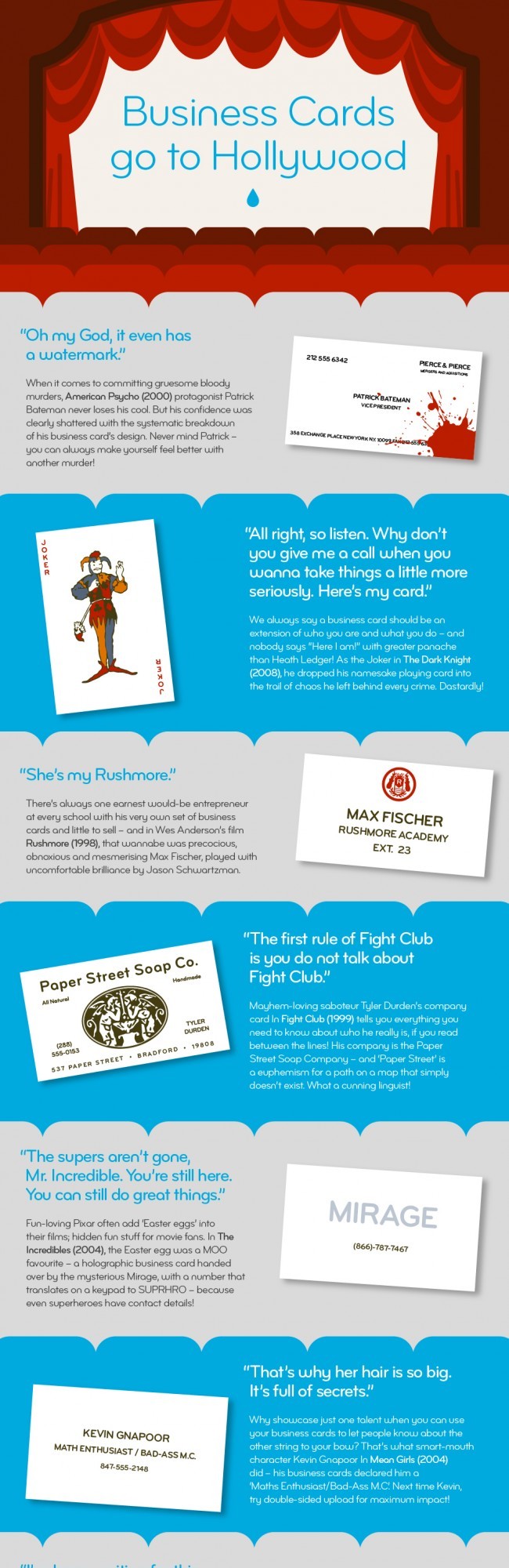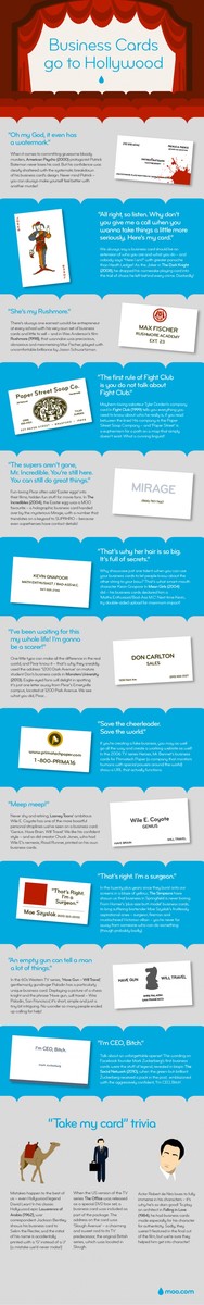 En estos mundos de la tecnología 2.0, de lo digital, de las apps apara todo lo imaginable hay viejos compañeras de viaje que se resisten a abandonar a la gente de empresa. Me refiero a las tarjetas de visita. Aprovechando la noche de los Oscars os traigo una infografía sobre las tarjetas de visita en el mundo del cine.