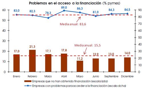 Las Cámaras de Comercio acaban de publicar su encuesta de financiación a pymes, obteniendo como espacio muestral a 1,66 millones de empresas con menos de 250 trabajadores, pero tomando como base muestral a 400 empresas solamente. De esta encuesta se extraen unas conclusiones interesantes, como son: * El porcentaje de empresas que han requerido financiación ha disminuido un 3,2% desde septiembre situándose en el 76% de las empresas encuestadas. * Sólo un 1,5% de las empresas encuestadas han accedido sin problemas a la financiación solicitada. (Datos que se extraen del gráfico que acompaña al post) * El número de empresas que no ha obtenido la financiación que han solicitado se situa en el 14%, intervalo superior al resto del año, pero lejos de los máximos de febrero que superaba al 21% de negativas al crédito.