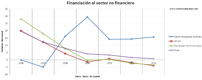 En el gráfico que acompaña al artículo se muestra la evolución de la deuda que han contraído las Administraciones Públicas desde 2007 hasta 2012 en comparación con la deuda de los agentes privados. La evolución de una y otra es más que significativa. La máxima expresión del fenómeno conocido como Crowding Out está presente. Y hoy más que nunca.