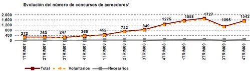 En el año 2009, los concursos de acreedores han aumentado un 80% en tasa interanual. Este incremento arroja un dato provisional de 5.922 procedimientos concursales. Destaca en esta cifra el repunte de procedimientos de concursos para personas físicas, con 938 procedimientos y 4.984 empresas.
