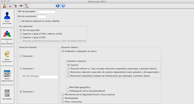 El funcionamiento es idéntico a otros años, pantalla de datos personales y tipo de contrato, pantalla de ascendientes y descendientes, datos económicos de la retribución, apartado para regularizaciones por cambios en la situación laboral durante el año y apartado de resultados.