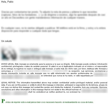 Ayer os hablaba de la dudosa o nula utilidad de los tochos de texto legal que se suelen incluir en los emails. Hoy quiero cerrar la entrada desde un punto de vista práctico y para ello, me he ido a mi bandeja de entrada, donde fácilmente he localizado un correo de una persona que utiliza textos de este tipo (tranquilos, he modificado la foto para evitar que se reconozca quien es:).