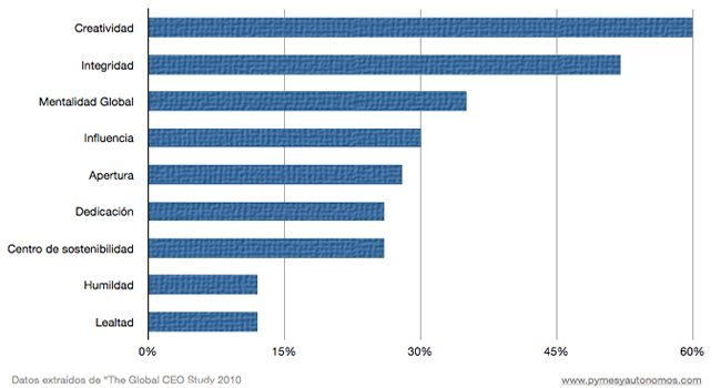Todos los problemas que nos afectan actualmente están modelando los conceptos establecidos y creando una nueva forma de ser. Para los próximos cinco años tenemos importantes retos en materia de liderazgo, que se reflejan en el gráfico que inicia este artículo. Como vemos, la mayoría de los CEOS entrevistados creen que la mayor cualidad de liderazgo necesaria será la creatividad.