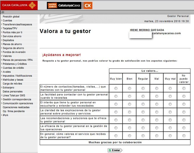 En esta línea, si realmente queremos conocer la opinión del cliente, debemos establecer preguntas directas y objetivas, como por ejemplo la imagen que acompaña el post y que sirve de formulario de valoración de Catalunya Caixa. En este caso, si se pueden marcar unas medias, tener una referencia muestral, conocer una nota que sirva para dirigir qué hay que mejorar y que no.