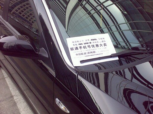 Como podéis ver en las imágenes que acompañan a esta entrada, para el cliente, o potencial cliente, no es desde luego muy agradable recibir estos elementos promocionales. A mi me molesta tener que sacar del parabrisas el maldito folleto (ya no te digo si me doy cuenta dentro del coche y aún encima llueve, blasfemar y acordarme de los muertos del que encargó la campaña es poco…), no me gusta que me inunden el buzón de casa de panfletos promocionales (un día voy a meter una rata dentro y el que meta la mano…) y mucho menos me gusta que me dejen una especie de percha de papel colgada de mi puerta (genial si me voy una semana de viaje y hay algún ladrón merodeando).