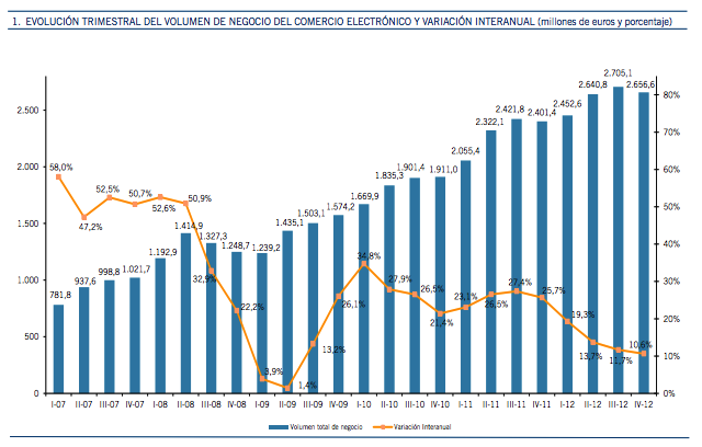 Las últimas cifras hechas públicas por la Comisión del Mercado de las Telecomunicaciones (CMT) vuelven a plantear un crecimiento sostenido en el último año del comercio electrónico en España, aunque con una leve desaceleración en el último trimestre respecto al anterior. Aún así, fueron 2.650 millones de euros los que conformaron el volumen de negocio, representando un 10,6% más. Ese incremento ha tenido una tendencia a la baja desde mediados de 2011, a lo que se puede achacar dos factores: el mayor desgaste del consumo y la menor capacidad para crecer tan rápido.