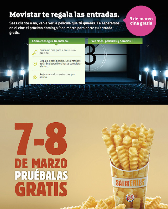 Este fin de semana hemos visto como dos multinacionales realizaban dos acciones para impactar a sus públicos y generar notoriedad acompañados de un mensaje positivo. Movistar justifica su acción como la "resaca" de los Oscars y es tanto para clientes como para no clientes. Mientras que Burger King lanza su nueva patata frita 'Satisfries' y durante todo el fin de semana ha regalado a quien se acercaba el producto.