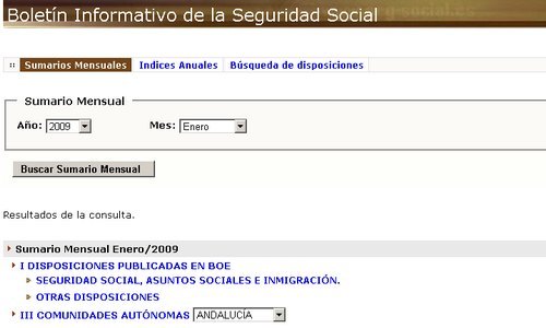 El buscador de legislación y otras disposiciones viene agrupado por materias, fechas, fecha de publicación en el BOE o número de BOE. No se cuanto tiempo llevará colocado este boletín en la página, pero la verdad que me ha resultado muy útil y fácil de manejo para mantenerse actualizado en materias de Seguridad Social.