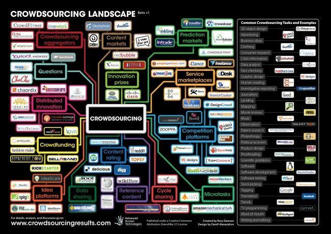 Quisero compartir con vosotros esta infografia (aquí a un tamaño cómodo), que viene a retratar un paisaje del crowdsourcing (obviamente centrado en USA). Es obra de crowdsourcingresults.com, una web orientada a explicarnos cómo usar las herramientas de crowdsourcing para hacer crecer nuestro negocio.