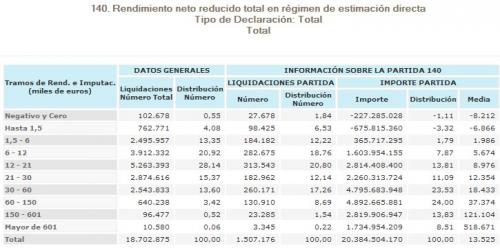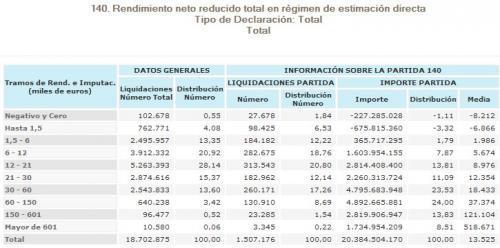 Ademas, destacamos por el lado negativo que 593.000 declarantes tienen un rendimiento neto inferior a 12.000 euros. Más aún, 126.103 declarantes tienen pérdias o rendimientos netos inferiores a 1.500 euros anuales. Si estas personas sólo cuentan con estos ingresos, podemos aseverar que el mileurismo afecta también a los autónomos, no sólo a trabajadores por cuenta ajena o pensionistas.
