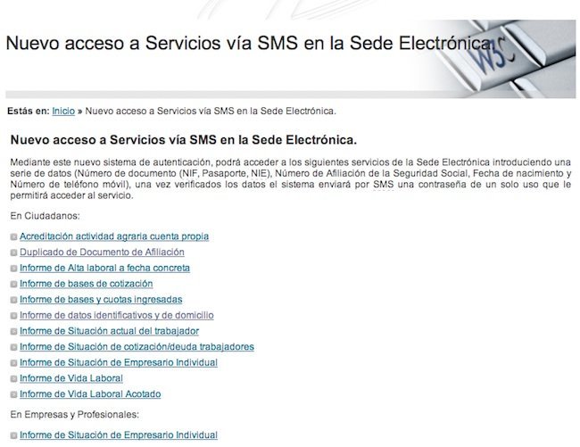 La Seguridad Social ha puesto en marcha un nuevo servicio de información al ciudadano para que obtengan los datos que precisen mediante el envío de un código de descarga por SMS sin necesidad de firma electrónica. El sistema funciona de una manera muy sencilla. Accedemos a la información que deseemos obtener que por ahora son todos los servicios que vemos en la imagen que acompaña al post, introducimos el NIF, Pasaporte, o NIE, Número de Afiliación de la Seguridad Social, Fecha de nacimiento y Número de teléfono móvil.