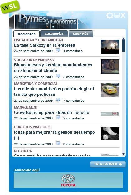 En este añadido para instalar en tu escritorio no sólo podréis leer los posts, sino también ver desde allí cualquier vídeo que colguemos sin tener que entrar en Youtube, todas las imágenes y cualquier otra actualización. El widget de Weblogs SL además nos permite seguir de forma más cómoda y con el mismo elemento, las otras publicaciones de Weblogs SL. Por defecto podéis colocar la publicación que queráis ¡Os recomendamos tener Pymes y Autónomos!
