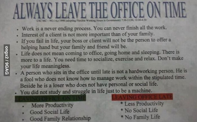 A este respecto, hoy he encontrado un curioso cartel que una empresa de Filipinas ha colocado para que sus empleados lo puedan leer, y en el que se dice literalmente que: "se vayan a casa a la hora, que un empleado sin vida familiar no produce". Como podrán comprobar, a este mensaje no le falta nada de razón, porque una persona que no disfrute de un descanso y de una vida social y familiar adecuados, no podrá dar el cien por cien en su puesto de trabajo.