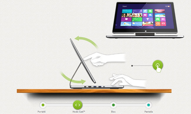 De todas formas no es nada nuevo que no tuviéramos disponible en otros portátiles, que nos permitían girar la pantalla para ponerla de cara al publico o abatirla, lo que si añade es un nuevo mecanismo que parece realmente cómodo. También Windows 8 es un sistema que va a aprovechar muy bien estas capacidades.