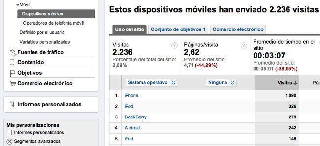 Si ya tienes Analytics instalado en tu sitio web podrás ver un par de informes que te darán información acerca de los dispositivos móviles que han accedido a tu sitio. Lo malo es que solo aquellos dispositivos que tengan capacidad de almacenar cookies y ejecutar javascript serán registrados correctamente, por ejemplo, los llamados teléfonos inteligentes.