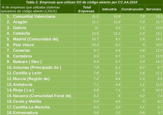 Para muchos es una buena noticia conocer que aumenta del uso de sistemas operativos de código libre en las empresas según los datos extraídos de la encuesta de uso de las TIC en el periodo 2009-2010 del Instituto Nacional de estadística. Aunque todavía tienen un porcentaje pequeño la curva de crecimiento se mantiene constante, pasando de un 6,8 a un 9,5%.
