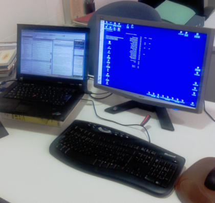 Portátiles: es muy sencillo, ya que el propio portátil incorpora una pantalla y tiene salida de vídeo para el monitor externo, con lo que se puede conectar un segundo monitor a la salida VGA (salida de vídeo estándar con 15 pines y conector normalmente azul). Yo recomendaría usar el monitor externo como principal y el del portátil como accesorio (ver foto al inicio de la entrada). Para ello es importante disponer de un teclado y ratón adicionales para situarlos enfrentados con el monitor externo por ergonomía. Si optáis por esta configuración es posible, si desconectáis el portátil sin apagarlo para usarlo sin monitor externo, que la imagen del desconectado monitor no vuelva a la pantalla del portátil. En este caso bastaría con reiniciar el equipo para recuperar la configuración normal.