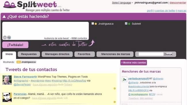 Gracias a este servicio llamado Splitweet puedes administrar varias cuentas de Twitter, siendo esto bastante productivo para administrar las cuentas de tu empresa. Hay muchas maneras de las que puedes utilizar Twitter para ayudarte a construir tu negocio. Por ejemplo, puedes realizar un seguimiento de temas de tendencias, analítica web y bastantes temas más.