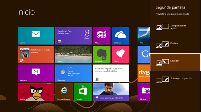 Lo cierto es que trabajar con varias pantallas en Windows 8 es realmente sencillo. Basta con conectarlas, seleccionar la opción de "Extender" y sólo con coger la aplicación y arrastarla a la pantalla que deseamos será suficiente. Si por cualquier motivo no detecta bien la configuración de la segunda pantalla siempre podemos cofigurarla de forma manual, con las mismas opciones de Windows 7.