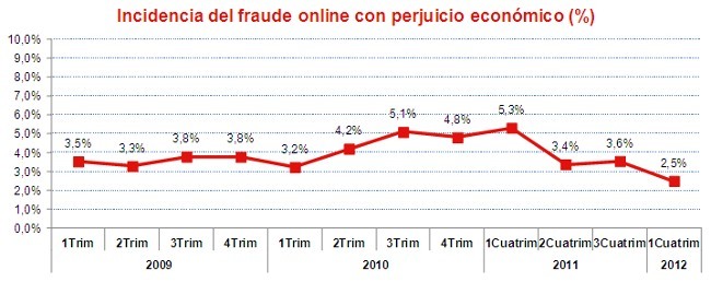 El INTECO ha publicado los datos del Estudio sobre el fraude online a través de Internet durante el primer cuatrimestre del año 2012. Según podemos observar continúa mejorando la seguridad de las compras en el comercio online. El dato más relevante es que el fraude con perjuicio económico se sitúa por debajo del 3%, el porcentaje más bajo desde que se está realizando dicho estudio.