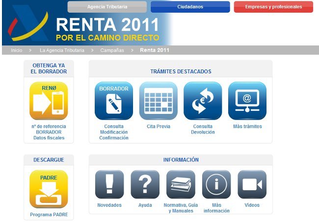 Hoy es el día que comienza el periodo para solicitar el borrador de la declaración de la RENTA, puesto que ya está disponible el borrador de IRPF y el programa PADRE para la RENTA 2011. Con un aspecto renovado de la web que parece adaptada a los nuevos tiempos y han optado por grandes iconos que facilitan la navegación desde móviles y tablets.