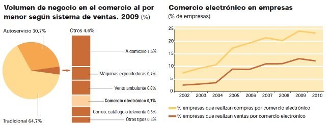 El volumen de la venta electrónica supone el 0,7% del volumen de negocio en el comercio al por menor, donde el sistema tradicional sigue representando un 64,7% y los autoservicios un 30,7% según los datos del instituto. En resumen parece que si tenemos un pequeño comercio es más sencillo colocar una máquina de vending que iniciar una tienda online.