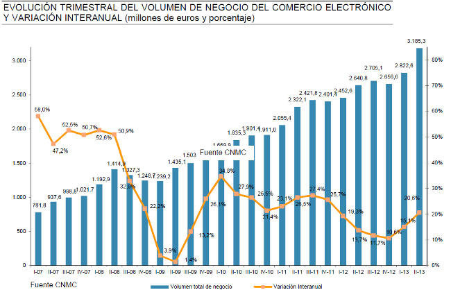 En el segundo trimestre de 2013 el comercio electrónico superó los 3.000 millones de facturación pero lo que es todavía más importante con un aumento interanual del 20,6%. Esto nos puede hacer preguntarnos dónde esta el techo del sector para saber si es o no buen momento para emprender un negocio o fortalecer el nuestro en este campo.