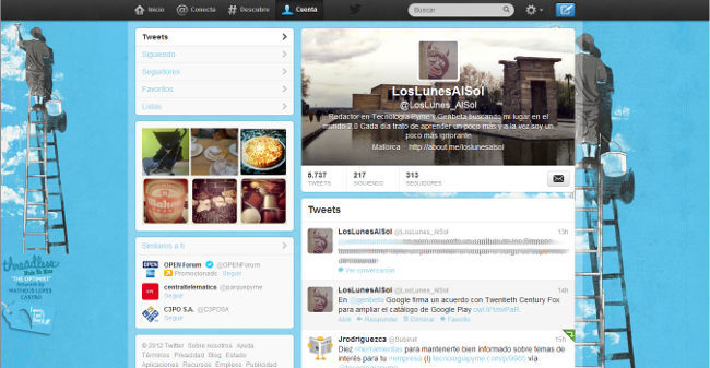 Ayer conocimos la noticia del nuevo diseño de Twitter. Es una buena idea que seguro que a muchas pymes les va a interesar ya que las imágenes en muchas ocasiones nos sirven para que los que llegan tengan un mejor conocimiento de a qué se dedica nuestra empresa. Por eso creo que el rediseño del perfil de Twitter supone una oportunidad de promoción para las pymes.