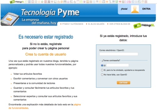 Si ya eres un usuario registrado en Tecnología Pyme tienes dos opciones: o seguir accediendo al blog con tu cuenta de OpenID como venías haciendo hasta ahora o, si así lo prefieres y te resulta más cómodo, registrar una cuenta estándar (con e-mail y contraseña) asociada a tu actual cuenta y página de usuario, de manera que puedas conservar toda la información (nombre de usuario, nombre completo y descripción), actividad (comentarios en posts, votos a posts y a comentarios, listas de expertos y seguidores) y el karma asociados a tu actual perfil. Para ello tienes que hacer lo siguiente: