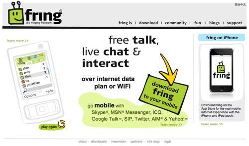 Fring es un sistema de mensajería con el que podemos ponernos en contacto con usuarios de casi cualquier protocolo existente (Skype, MSN Messenger, ICQ, Google Talk™, SIP, Twitter, AIM & Yahoo!™) mediante chat y realizar llamadas entre usuarios de éste y otros sistemas, como es el caso de Google Talk™ y Skype. Funciona con conexiones GPRS, 3G y wifi, aunque parace que las llamadas de voz con GPRS no permiten obtener muy buena calidad.
