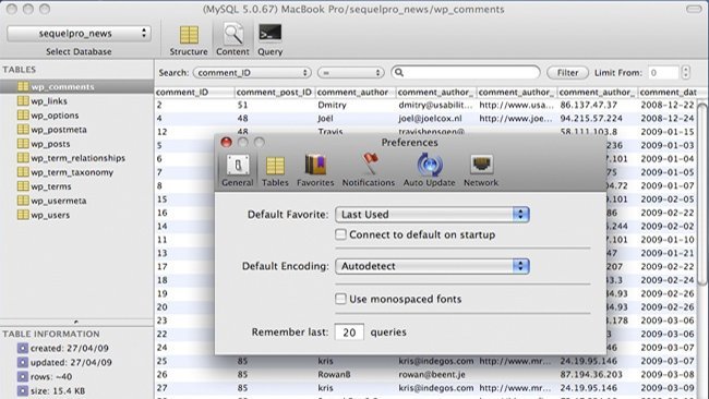 Podemos usar Sequel Pro vía SSH tras un firewall o de manera local por nuestra red. Es posible conectarse a varias bases de datos a la vez y nos da información de las mismas después de hacer una consulta con más de treinta opciones de codificación. Con esta aplicación también podemos crear copias de seguridad de las bases de datos de la PYME y restaurarlas de manera sencilla.