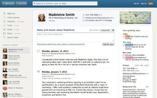 Por cada contacto que tenemos Highrise crea una página para el mismo donde tenemos todo el historial de acciones que hemos realizado. Las conversaciones que hemos mantenido, los correos que nos hemos cruzado o los presupuestos que le hemos enviado, por ejemplo. Además disponemos de datos de contacto, ubicación, etc. Además le podemos añadir etiquetas, lo que facilita mucho la búsqueda por empresas, departamentos, sectores, por citar algunos ejemplos.