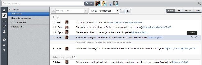 Hootsuite ha incorporado una nueva vista de mensajes programados que permite tener una visión de todos los comentarios que hemos dejado preparados para que se publiquen en las redes sociales de manera automática. En esta vista podemos ver quién ha realizado la programación, a en qué fecha y hora está programado.