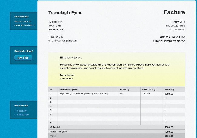 Se trata de un servicio tipo que nos presenta un modelo de factura estándar que nos sirve como modelo. No requiere ningún tipo de registro y sólo tenemos editar los campos para componer la factura con nuestros datos. Una vez completada podremos descargar la factura en formato PDF que podremos enviar por correo electrónico o imprimir para entregar al cliente.