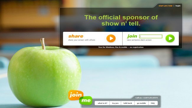 Join.me sólo hace un año que se lanzó al mercado y ya cuenta con millones de usuarios; no es necesario registrarse, es gratuito, no requiere plug-ins y la compartición de pantalla es casi instantánea. Su versión gratuita del servicio permite un número ilimitado de sesiones de compartición de pantalla y reuniones on-line para. La versión Pro, con infinidad de utilidades tiene un precio de 13 € al mes o 104 € al año.