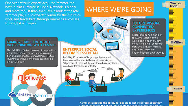 Ya hace un año de la adquisición de Yammer por parte de Microsoft y lo cierto es que la evolución e integración de la red social con los productos de la empresa ha sido muy buena. Y no es más que el principio ya que según Microsoft la mitad de las empresas usarán las redes sociales para mejorar comunicación interna en 2016.