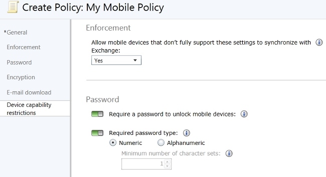 Los responsables IT de las organizaciones podrán establecer políticas de seguridad para los dispositivos móviles y aplicar protección por contraseña, cifrado de archivos o incluso borrado remoto si el teléfono o tablet se ha extraviado o se ha perdido. Cualquier dispositivo con soporte para Microsoft Exchange ActiveSync se podrá administrar a través de Intune, incluyendo Windows Phone, iOS y Android.