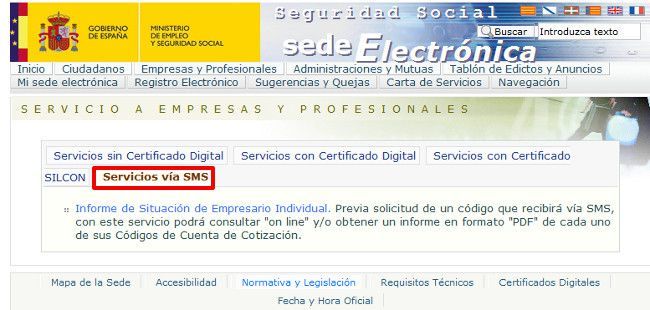Para acceder al servicio tendremos que ir a la sede electrónica de la Seguridad Social, en el área de servicio a empresas, una pestaña identificada como "Servicios Vía SMS" le conduce hasta la pantalla con el catálogo de servicios disponibles en la nueva aplicación. De momento las empreas sólo pueden acceder al Informe de situación de Empresario Individual, pero es un primer paso. Para el ciudadano las opciones son mucho más amplias.