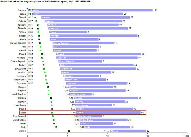 Los países que ofrecen mayores velocidades tienden a tener también un precio más bajo, con Suecia (0,09 euros) y Finlandia (0,15 euros) como los más competitivos. Sin embargo nosotros tenemos que pagar 1,16 euros por lo mismo. Desde luego esta no la manera de apoyar al sector productivo para tratar de salir de la crisis apostando por la innovación.