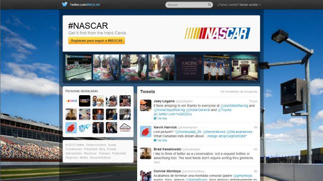 Se inauguró este fin de semana con la carreras de la fórmula NASCAR, muy populares en Estados Unidos. Se trata de una página donde, según comunican desde Twitter, una combinación de algoritmos hacían que se mostraran los mensajes más interesantes sobre este acontecimiento en tiempo real. No sólo aquellos que incluían el hashtag #nascar, sino también todos aquellos que añadían información sobre lo que ocurría alrededor de la pista, desde los boxes hasta la meta.
