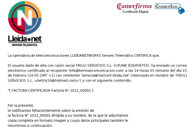 Lleida.net emite un certificado como operador y tercero de confianza en el que consta la factura, el texto, la fecha y hora de emisión y así como la hora de entrega, pudiendo demostrar de forma fehaciente que las facturas se entregaron en tiempo y forma con plena validez jurídica.