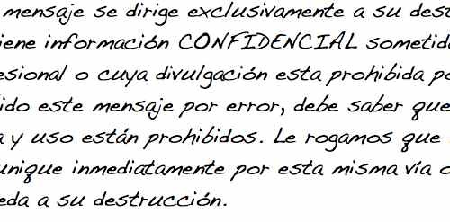 "Este mensaje se dirige exclusivamente a su destinatario. Contiene informacion CONFIDENCIAL sometida a secreto profesional o cuya divulgación está prohibida por la ley. Si ha recibido este mensaje por error, debe saber que su lectura, copia y uso estan prohibidos. Le rogamos que nos lo comunique inmediatamente por esta misma vía o por teléfono y proceda a su destruccion."