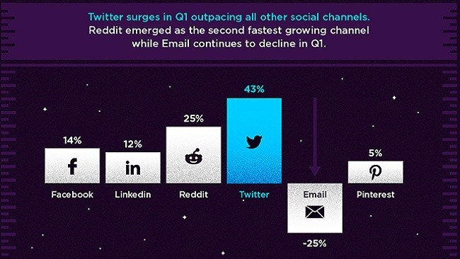 A pesar de los crecimientos registrados, Facebook es la red social líder para compartir contenidos y Twitter se encuentra en segundo lugar. El tercero de la lista es Pinterest, que fue la red social con mayor crecimiento en 2013, que sólo aumentó un 5% en el primer trimestre, según el informe.