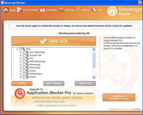 Messsenger Blocker está diseñada para bloquear y registrar el uso de la gran mayoría de clientes de mensajería instantánea (MI) más comunes en la actualidad, como: Windows Live Messenger (MSN), Yahoo! Messenger o GTalk, y algunos mas. La aplicación puede ser configurada para iniciar automáticamente con el PC y si tenemos varias cuentas de usuarios registrados en el cliente de MI, es posible especificar que usuarios deseamos bloquear, o limitar los bloqueos y usos del servicio MI a un determinado horario predefinido.